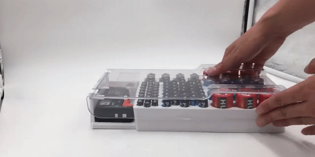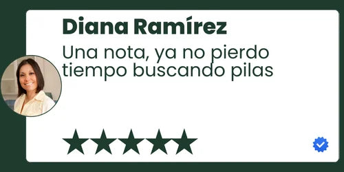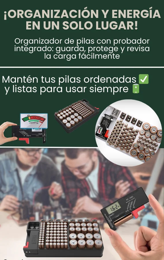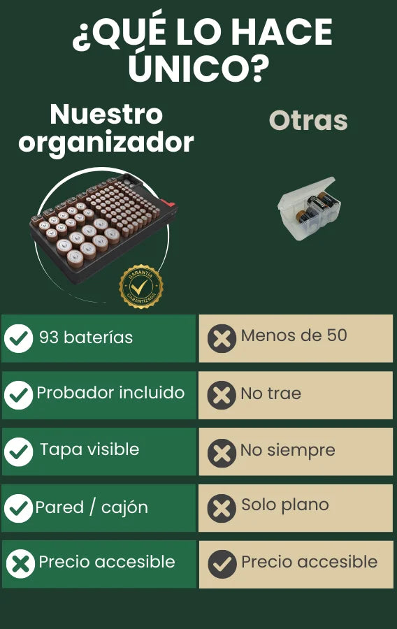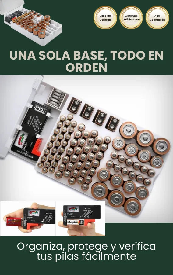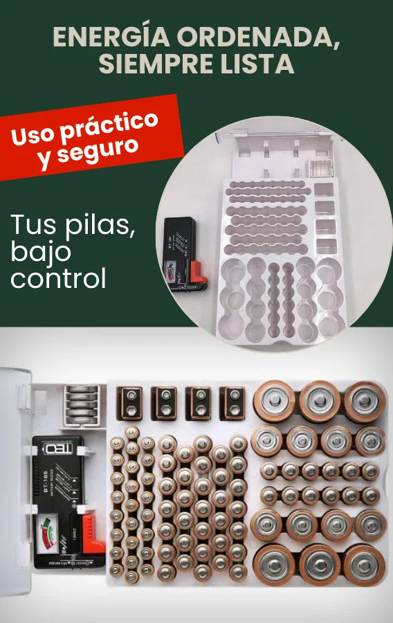 El organizador incluye espacios amplios: 45 AA, 25 AAA, 8 C, 6 D, 4 de 9V y 5 de botón. Esto garantiza lugar suficiente para almacenar diferentes marcas o lotes del mismo tipo sin mezclarlas.