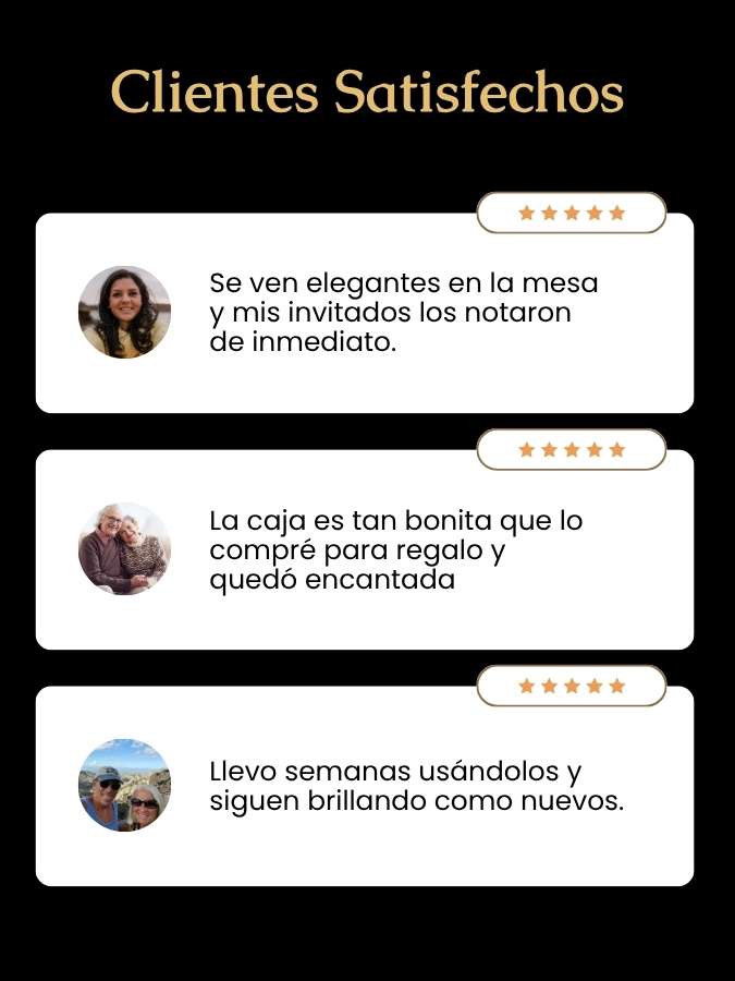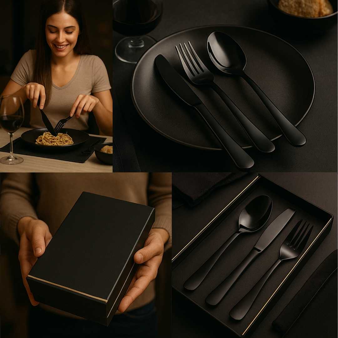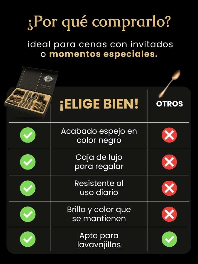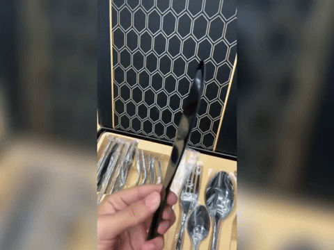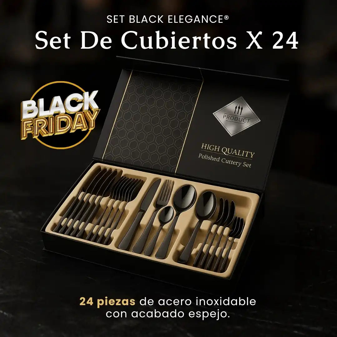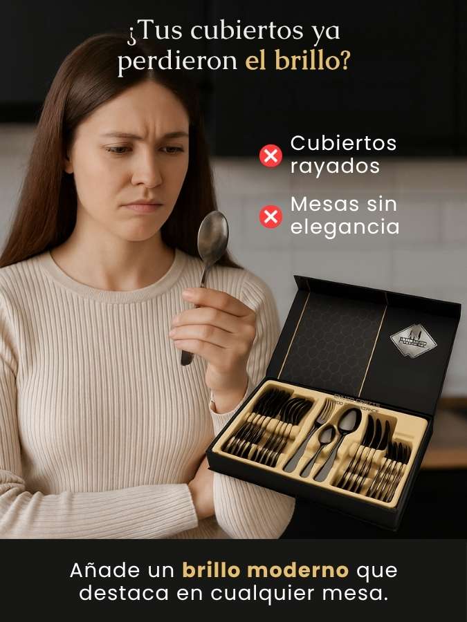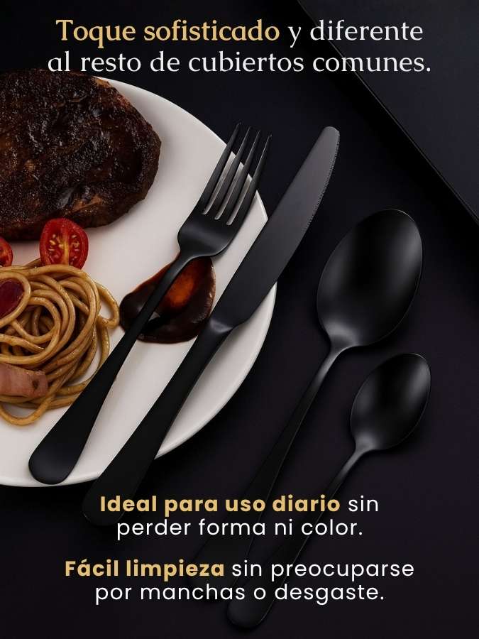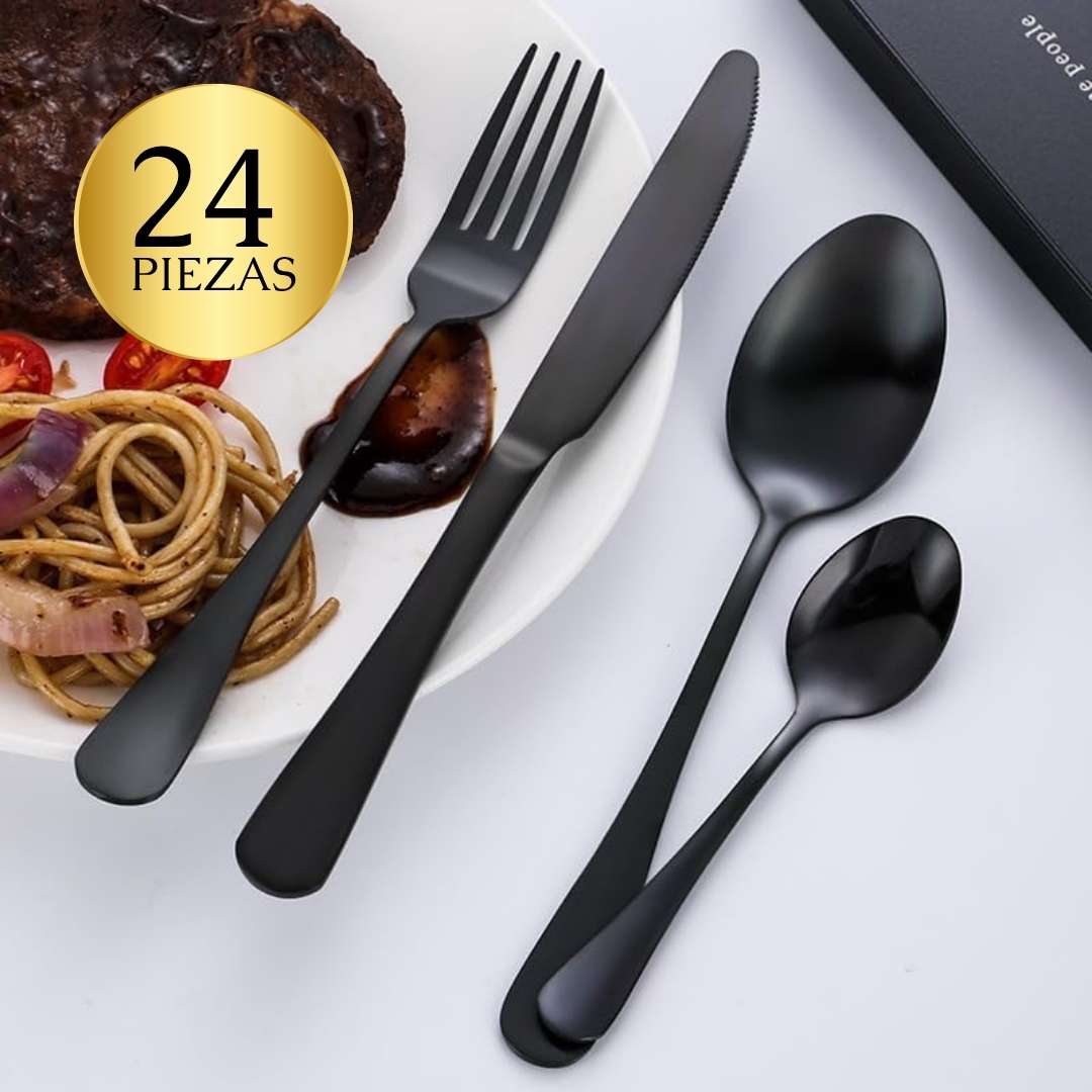 Incluye 24 piezas en total: 6 tenedores, 6 cuchillos, 6 cucharas soperas y 6 cucharas de postre.