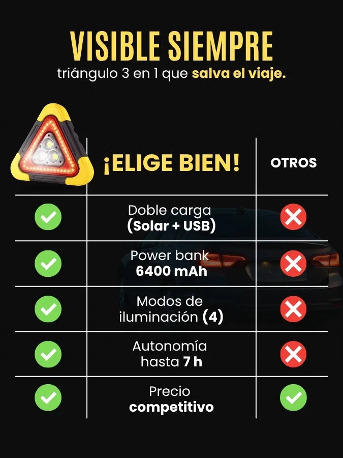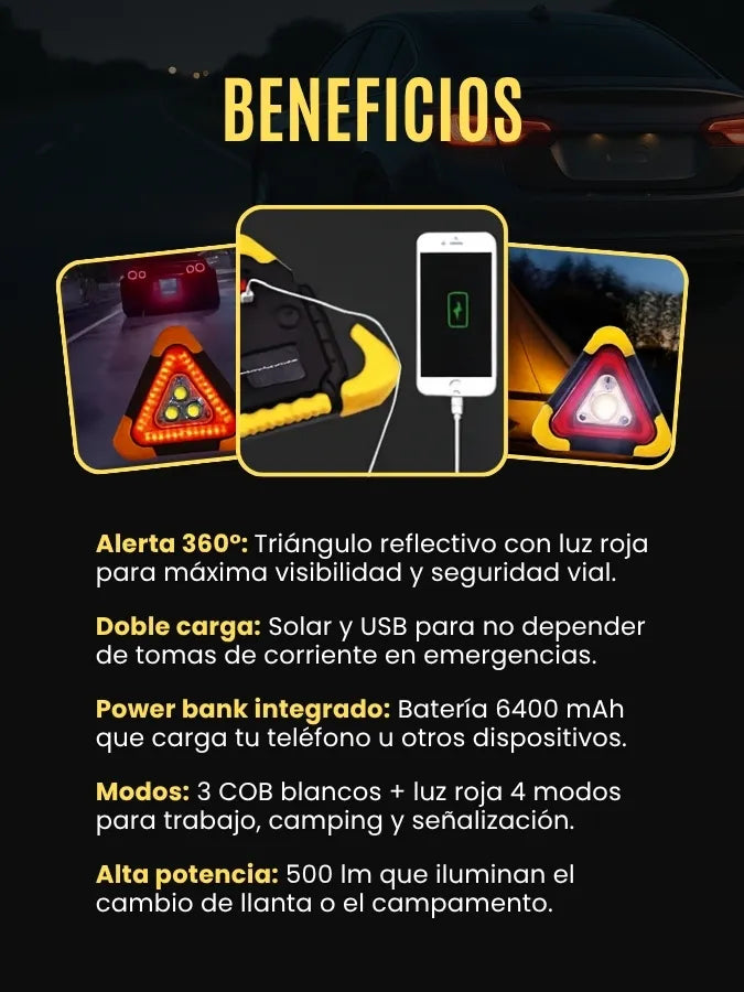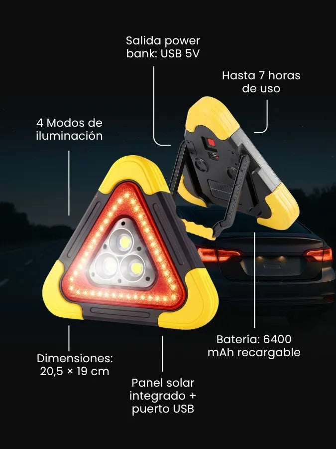 Cuenta con panel solar para recarga lenta y puerto USB para carga rápida con cargador de pared, carro o power bank.