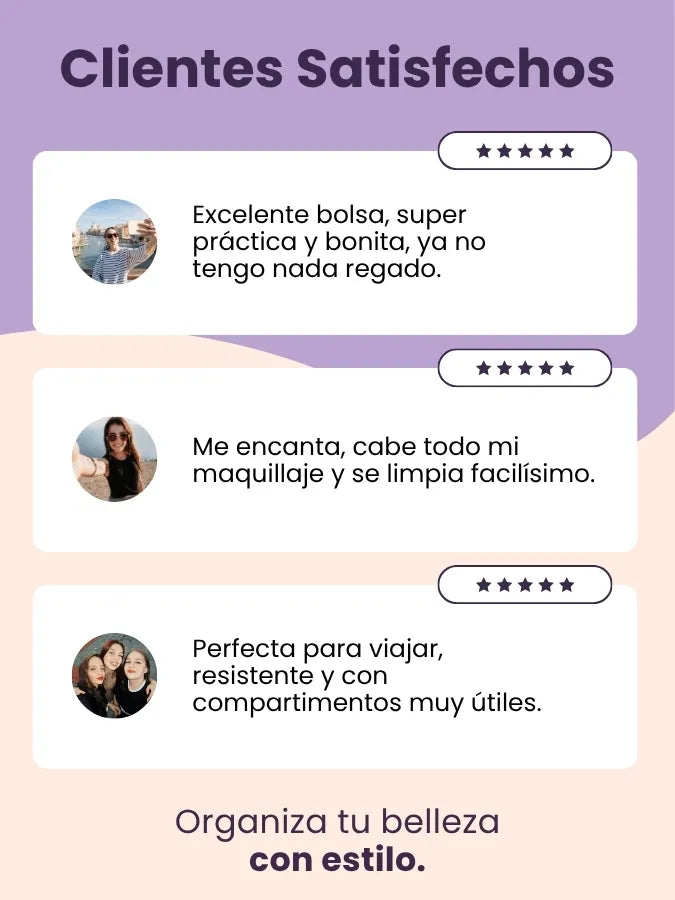 Tres amplios compartimentos con cierre seguro y espacio para brochas, cremas y accesorios.